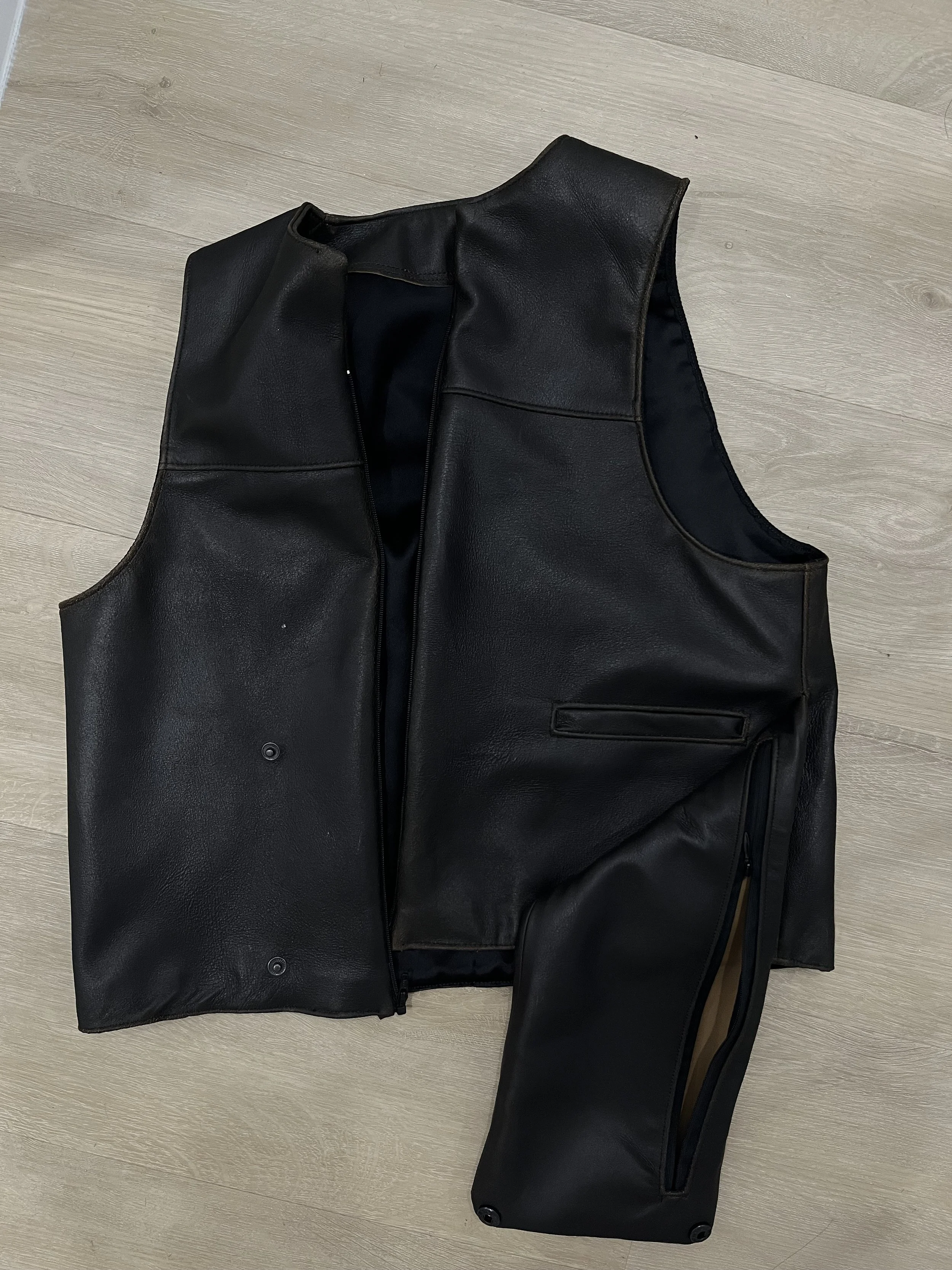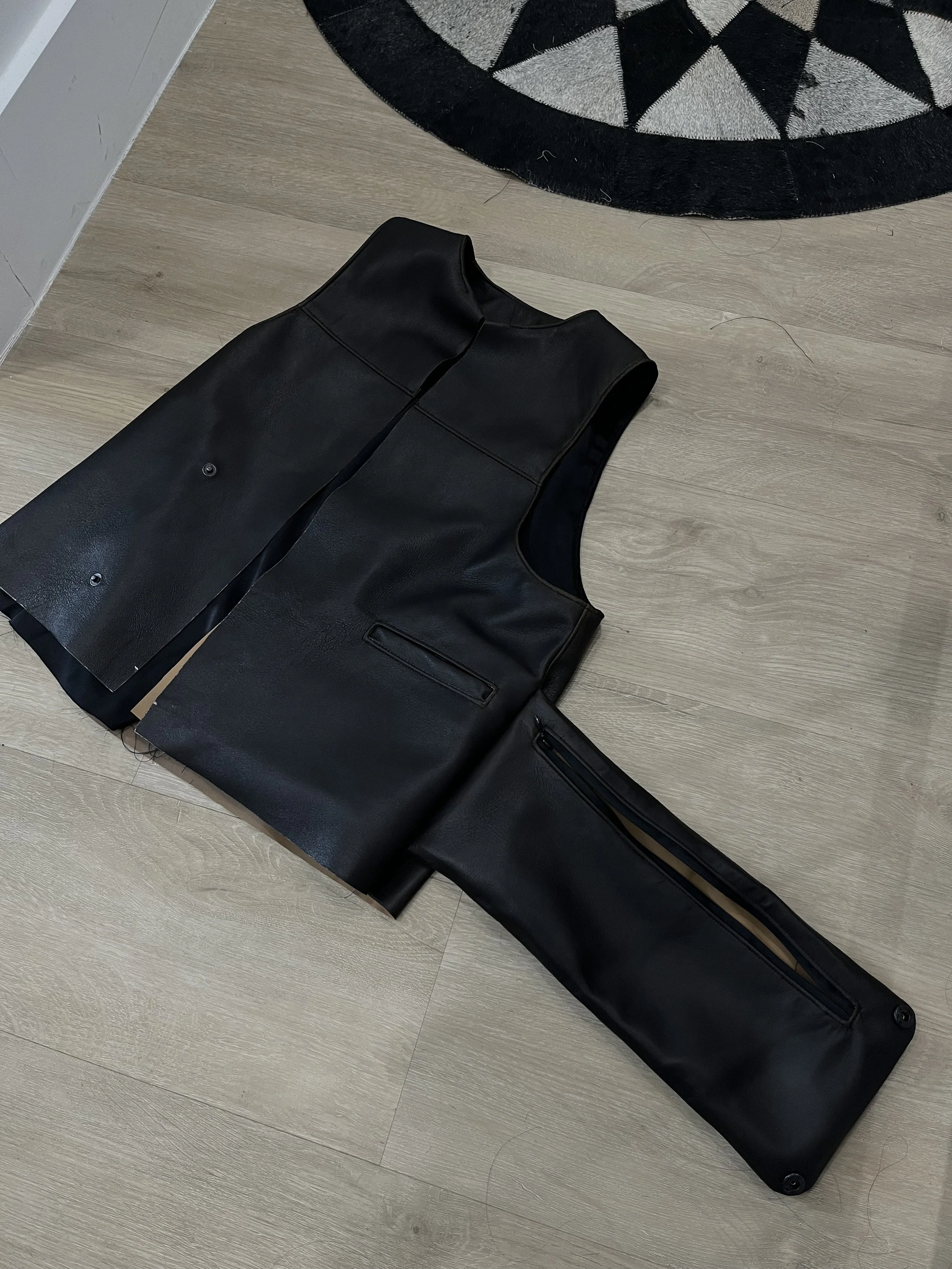 Mini-collection of three garments commissioned out of leather. My client commissioned me to make leather shorts, a miniskirt, and a vest. For the vest, we referenced Miu Miu Fall/Winter 1999.